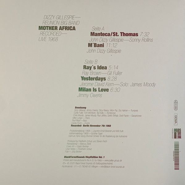 Виниловая пластинка DIZZY GILLESPIE / REUNION BAND - MOTHER AFRICA - LIVE 1968 (1LP)
