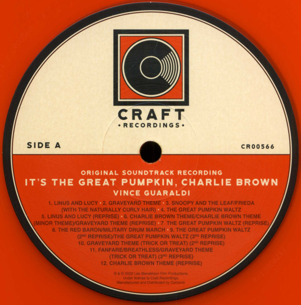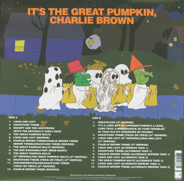 A1 - Linus & Lucy A2 - Graveyard Theme A3 - Snoopy & The Leaf / Frieda (With The Naturally Curly Hair) A4 - The Great Pumpkin Waltz A5 - Linus & Lucy (Reprise) A6 - Charlie Brown Theme / Charlie Brown Theme / Graveyard Theme (Minor Theme - Reprise) A7 - The Great Pumpkin Waltz (Reprise) A8 - The Red Baron / Military Drum March A9 - The Great Pumpkin Waltz / The Great Pumpkin Waltz (2nd Reprise - 3rd Reprise) A10 - Graveyard Theme (Trick Or Treat) (2nd Reprise) A11 - Fanfare / Breathless / Graveyard Theme (Trick Or Treat) (2nd Reprise - 3rd Reprise) A12 - Charlie Brown Theme (Reprise) B1 - Breathless (2nd Reprise) B2 - It's A Long Way To Tipperary / There's A Long, Long Trail A-Winding / Pack Up Your Troubles In Your Old Kit Bag / Roses Of Picardy B3 - Graveyard Theme (Trick Or Treat) (4th Reprise) B4 - Linus & Lucy / Linus & Lucy (2nd Reprise - 3rd Reprise) B5 - Charlie Brown Theme (2nd Reprise) B6 - Linus & Lucy (Alternate Take 1) B7 - Graveyard Theme (Alternate Take 1) B8 - Charlie Brown Theme (Alternate Reprise Take 1) B9 - Linus & Lucy (Alternate Take 2) B10 - The Great Pumpkin Waltz (Alternate Take 2) B11 - Linus & Lucy (Alternate Reprise Take 1) B12 - Charlie Brown Theme (Alternate Reprise Take 2)Характеристики